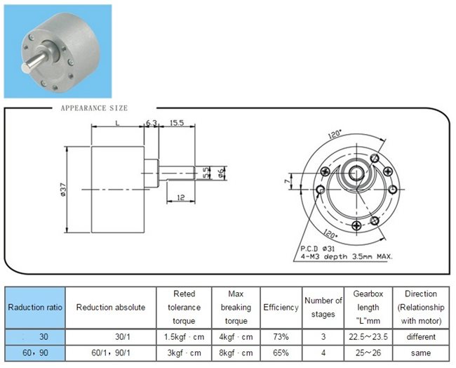 Động cơ DC 24V 6800rpm có hộp số với các tỉ số truyền 20k, 30k, 60k, 90k, 180k